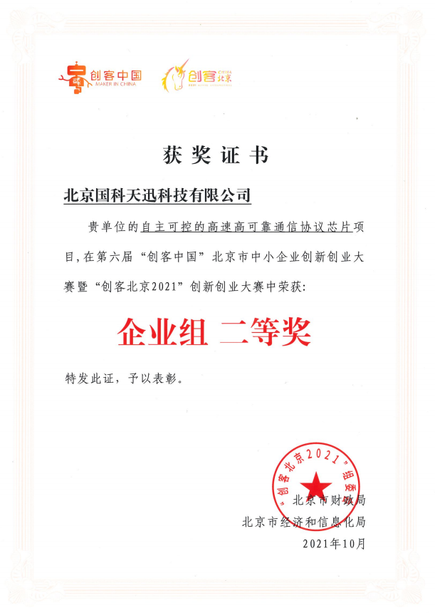 大赛自6月启动以来,受到广大中小企业和创客团队高度关注,吸引了全市近5千个项目报名。国科天迅参赛的“自主可控的高速高可靠通信协议芯片”项目,经初赛、复赛两个月激烈角逐,在众多项目中表现抢眼,成功入围新一代信息技术领域决赛,经路演获企业组百强,后与百家企业共同比拼及专家组评审后最终获此殊荣。